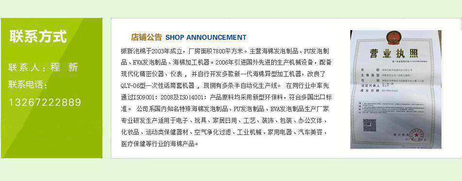 深圳市振新泡棉科技有限公司于2003年成立,廠房面積7800平方米。主營海棉發泡制品、PU發泡制品、EVA發泡制品、海棉加工機器。2006年引進國外先進的生產機械設備,配備現代化精密儀器、儀表 , 并自行開發多款新一代海棉異型加工機器,改良了QLY-06型一次性話筒套機器 , 現擁有多條半自動化生產線。 我們擁有一批經驗豐富的工程技術人員和高級管理人員,在同行業中率先通過ISO9001:2008及ISO14001:產品原料均采用新型環保料,符合多國出口標準。 公司系國內知名特殊海棉發泡制品、PU發泡制品、EVA發泡制品生產廠家,專業研發生產適用于電子、玩具、家居日用、工藝、裝飾、包裝、辦公文體、化妝品、運動類保健器材、空氣凈化過濾、工業機械、家用電器、汽車美容、醫療保健等行業的海棉產品。 產品的類型如:高密度聚酯海棉、普通海棉、異型定型海棉、防火/阻燃海棉、高回彈/慢回彈海棉、過濾網狀海棉、EVA玩具禮品、PU發泡定型玩具禮品等等。產品名稱如:耳機/話筒KTV海棉套、海棉圓球、洗刷海棉、吸水海棉、木漿海棉、化妝海棉、相機海棉、墨盒海棉、壓縮海棉、橡膠海棉、粗細孔過濾海棉、波峰隔音海棉、醫用海棉、海棉枕頭、包裝防震海棉、1mm厚海棉、電子/醫用海棉棉簽、EVA球、EVA智力拼圖、EVA鑰匙扣、PU座墊、PU公仔、PU球類等等。 我們還獲得多家國際知名廠商的授權資格,代理多品種家庭用品。 產品多年來一直銷往全球,深受廣大用戶和客商的青睞。
